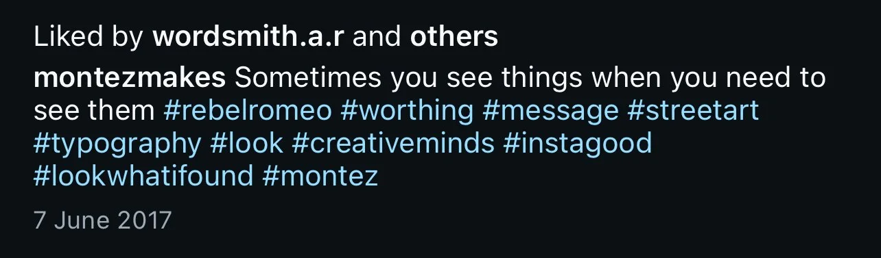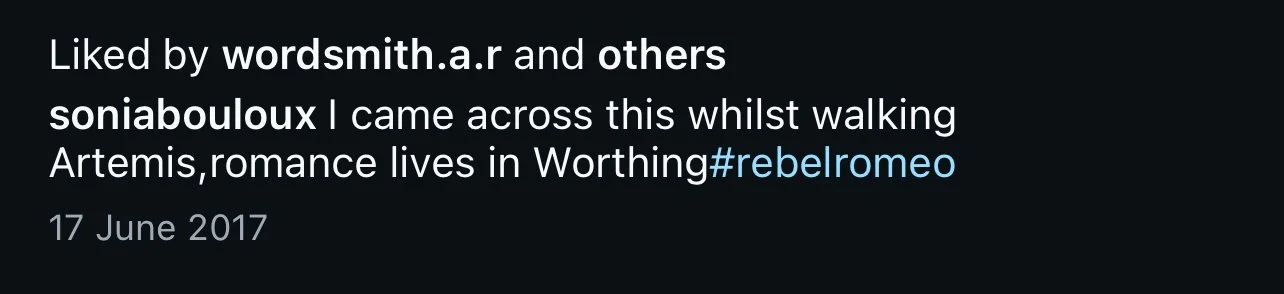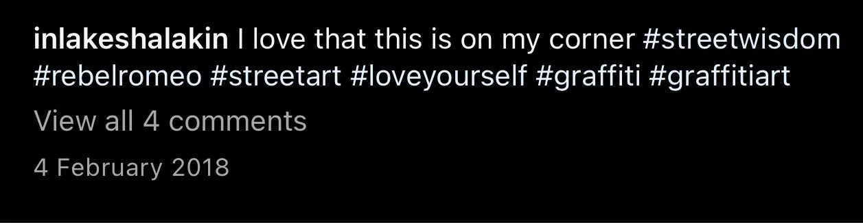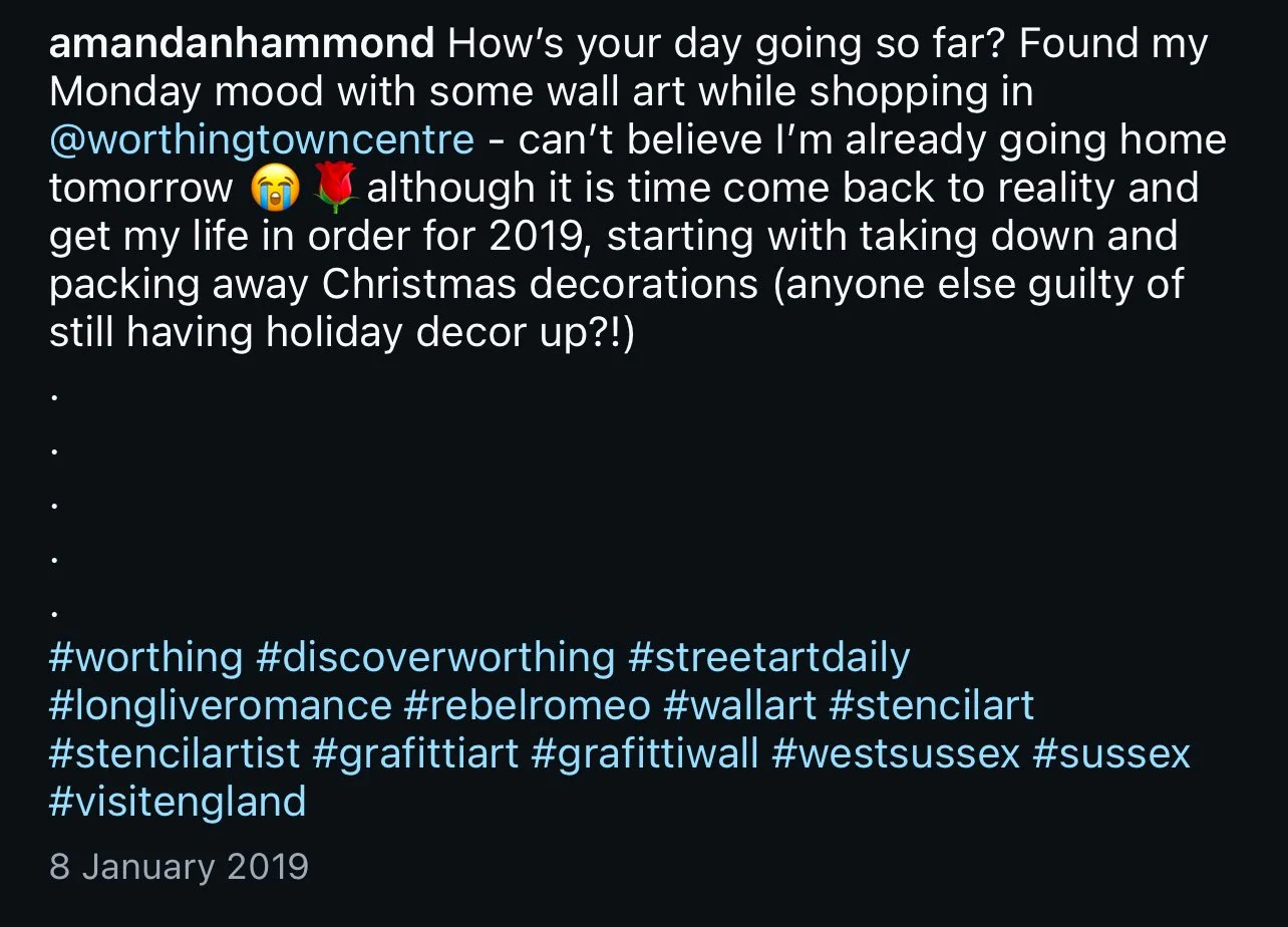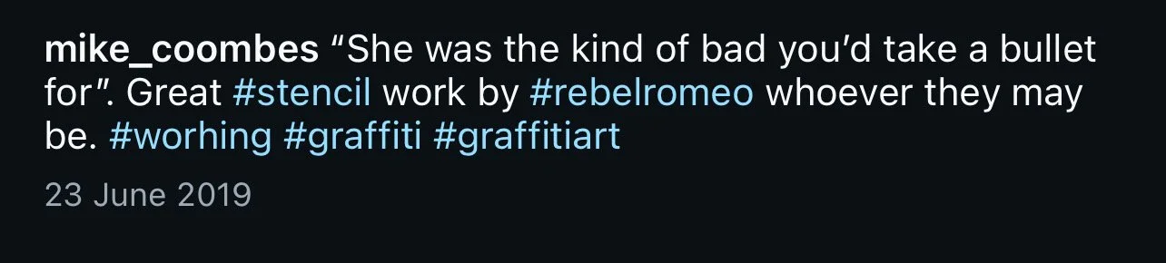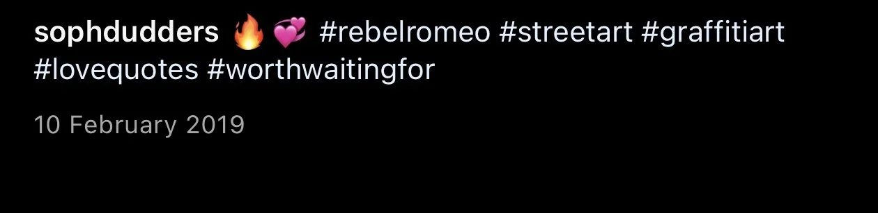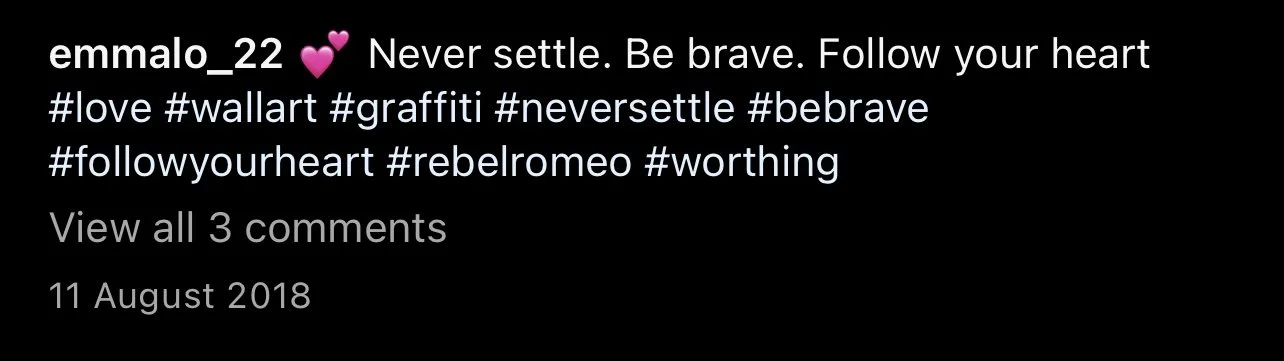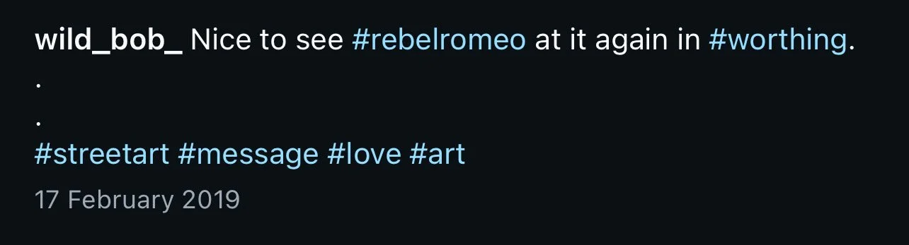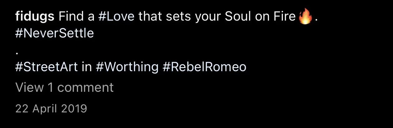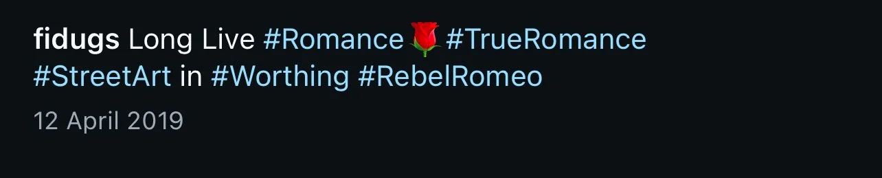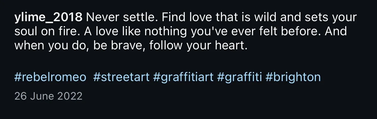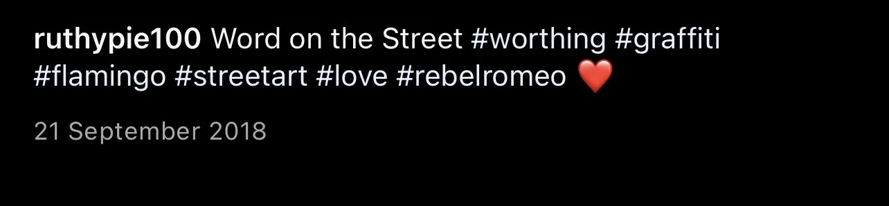 Starting in Spring of 2017, I took my poetry from Instagram to the streets of Worthing, painting words of love and hope for strangers to see. Armed with stencils and spray paint, I worked in the early hours, transforming walls into canvases for emotion and expression. Over time, my work became part of the town’s visual landscape, with passersby capturing and sharing it under the hashtag #RebelRomeo. This collection features photos taken by the public—moments of connection between art and audience, seen through their eyes.