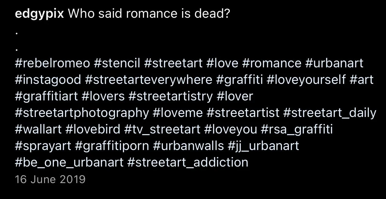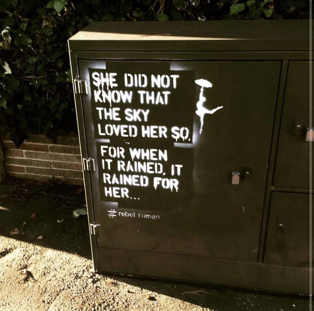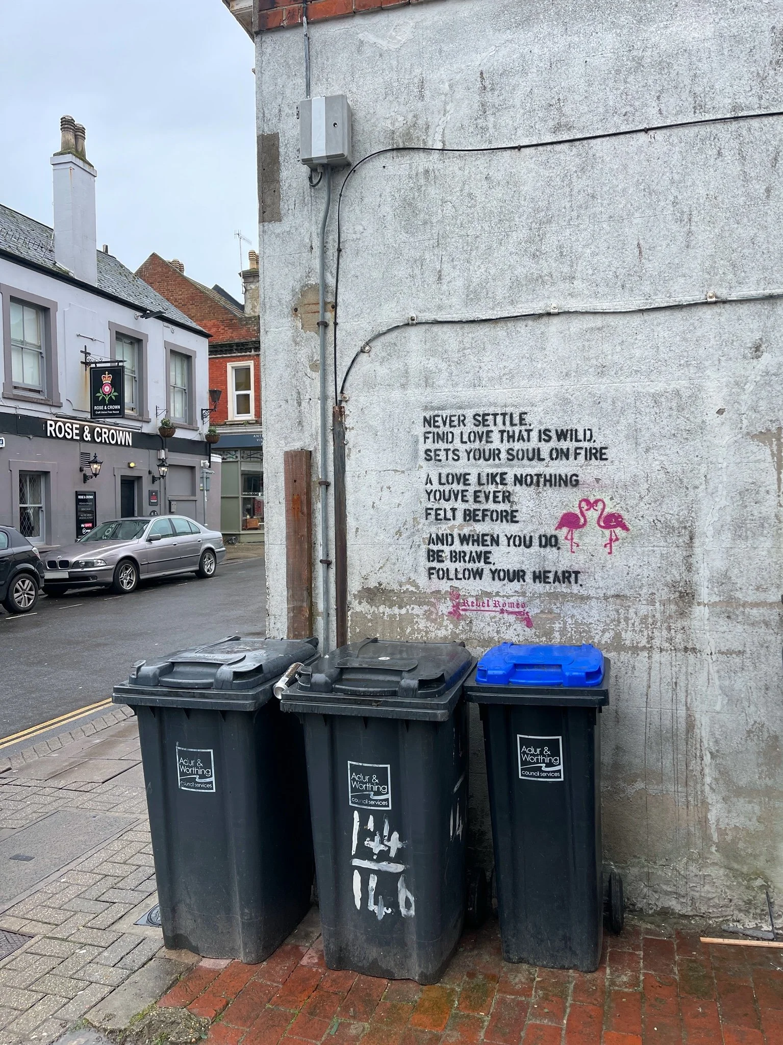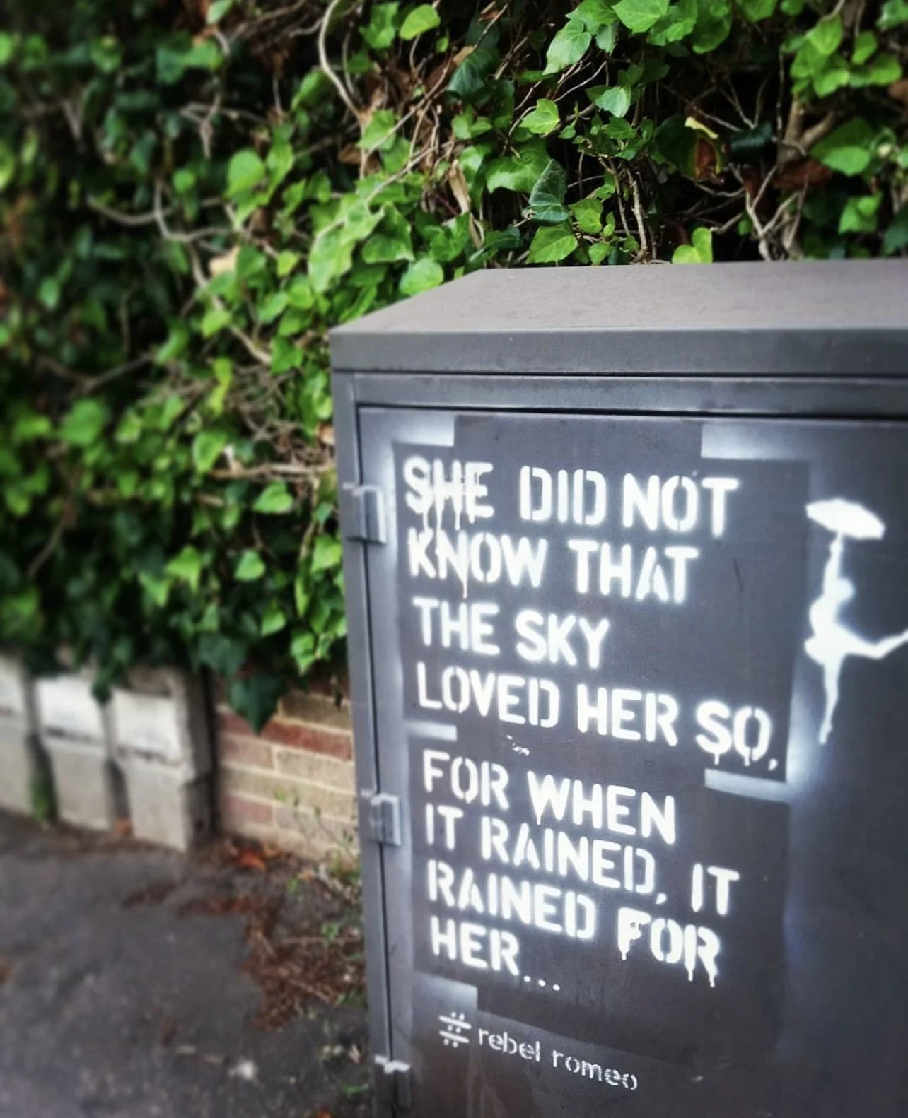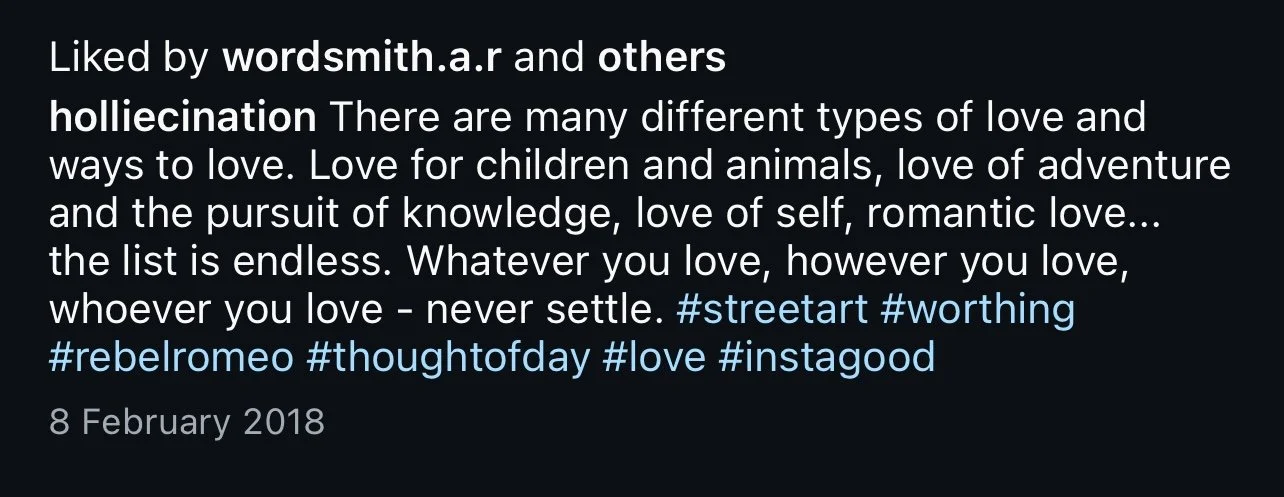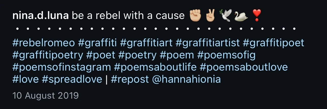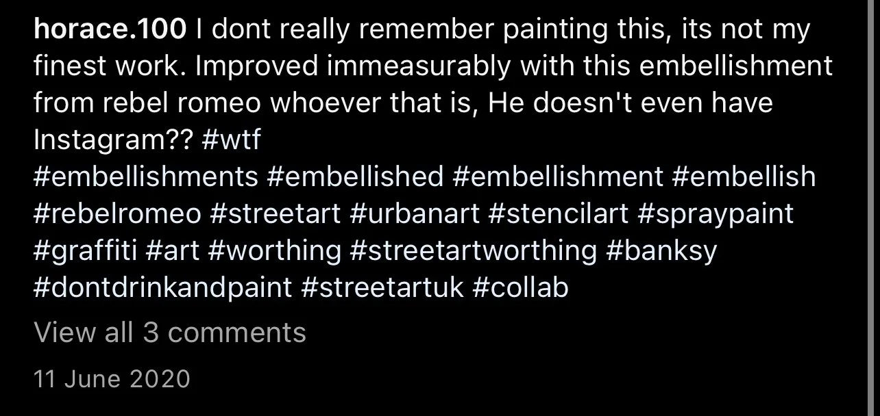 Starting in Spring of 2017, I took my poetry from Instagram to the streets of Worthing, painting words of love and hope for strangers to see. Armed with stencils and spray paint, I worked in the early hours, transforming walls into canvases for emotion and expression. Over time, my work became part of the town’s visual landscape, with passersby capturing and sharing it under the hashtag #RebelRomeo. This collection features photos taken by the public—moments of connection between art and audience, seen through their eyes.